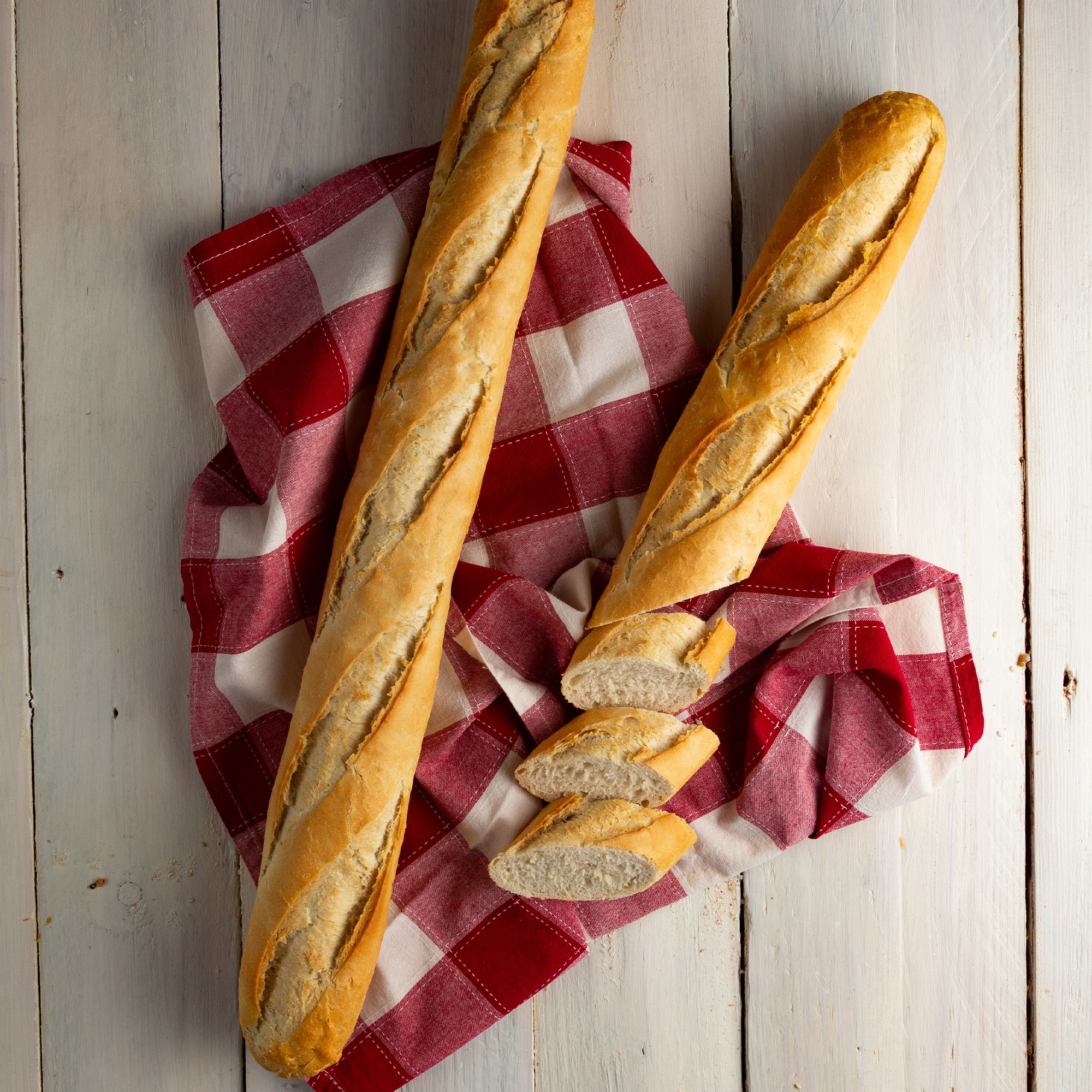Κλασική Γαλλική Μπαγκέτα σίτου με ρουστίκ επιφάνεια για σάντουιτς, με δύο διαγώνια σχισίματα.