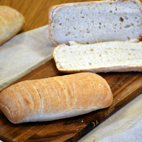 Ιταλική ρουστίκ τσιαπάτα σίτου με πλούσια κυψέλωση και τραγανή κρούστα ελαφρώς αλευρωμένη. Πλήρως Ψημένη.